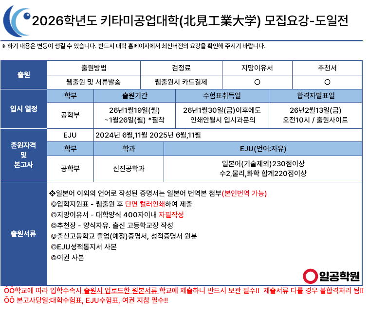 [국립] 2026학년도 키타미공업대학 모집요강