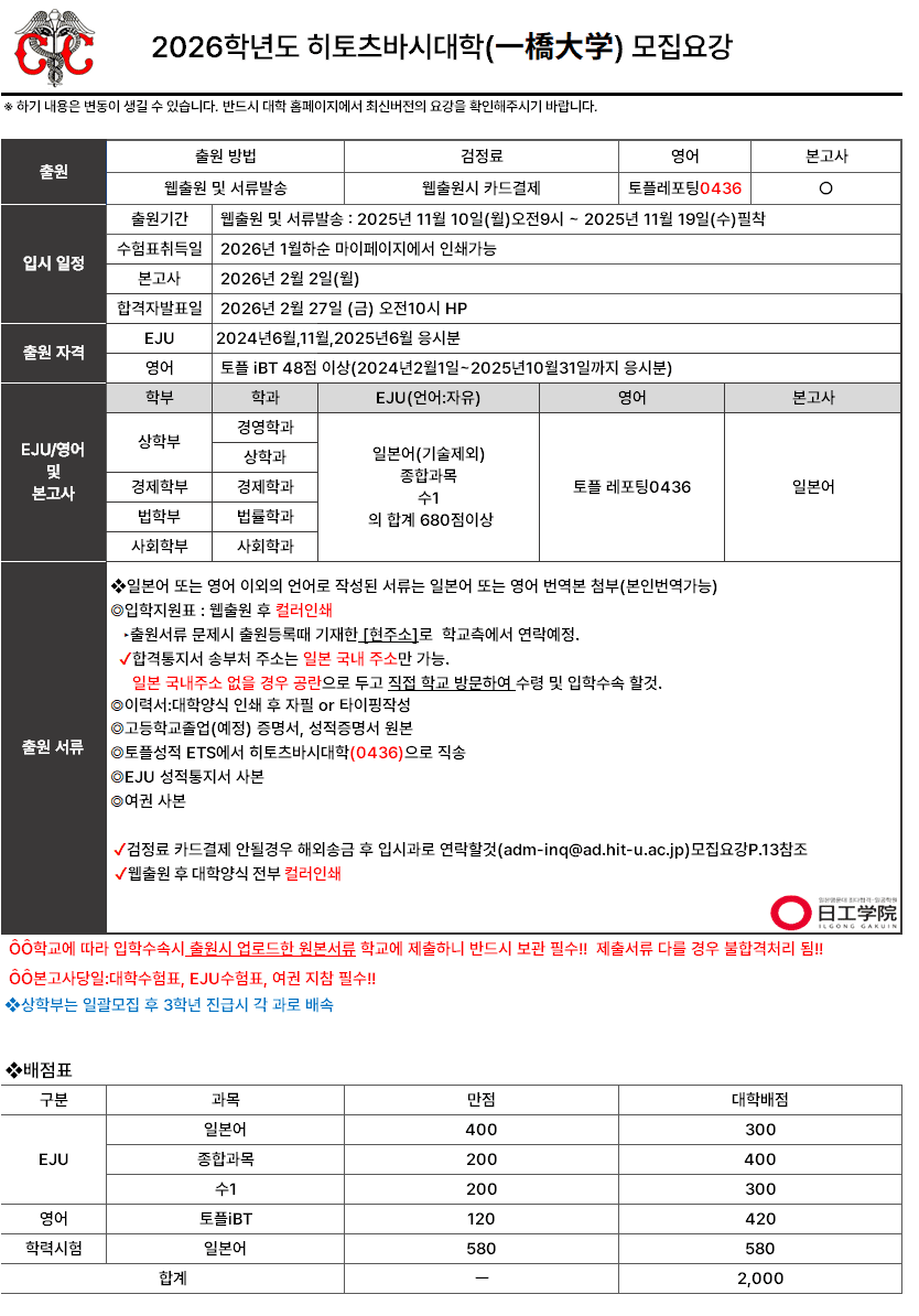 [국립] 2026학년도 히토츠바시대학 모집요강