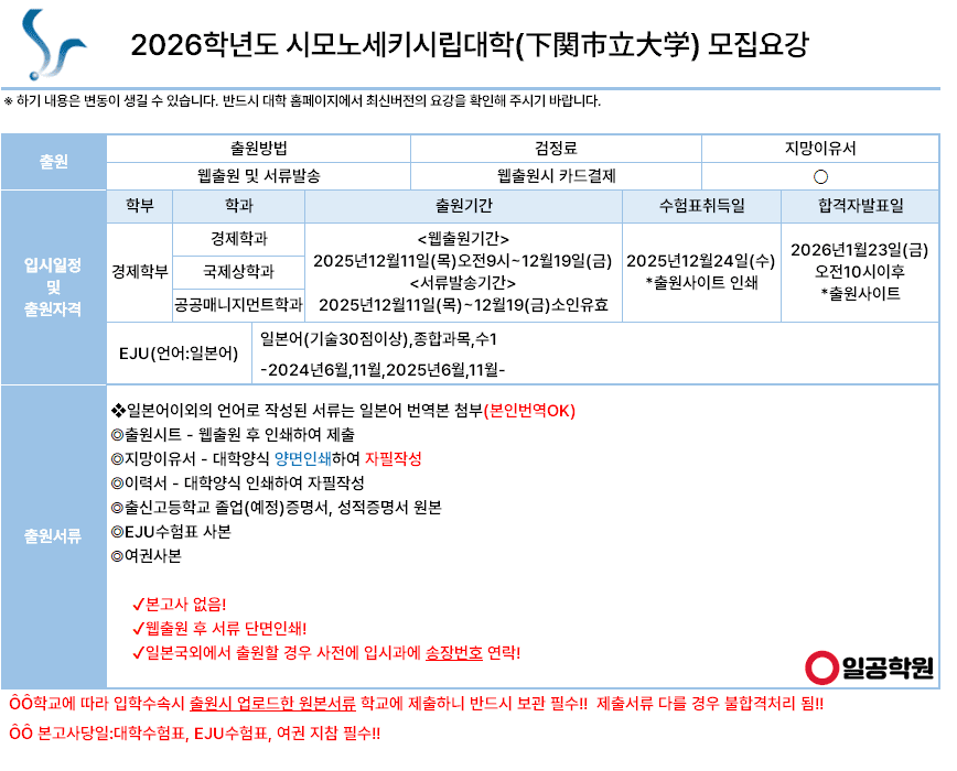 [공립] 2026학년도 시모노세키시립대학 모집요강