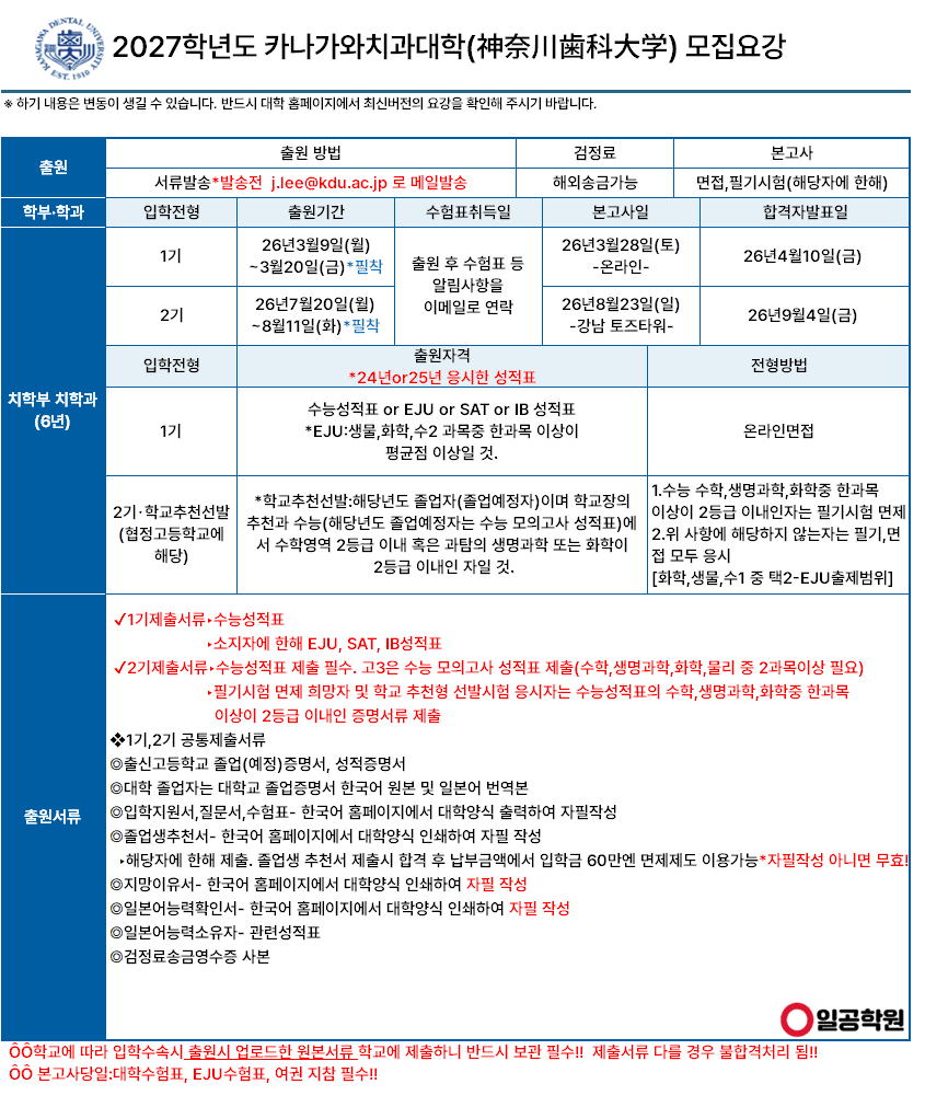 [사립] 2027학년도 카나가와치과대학 모집요강