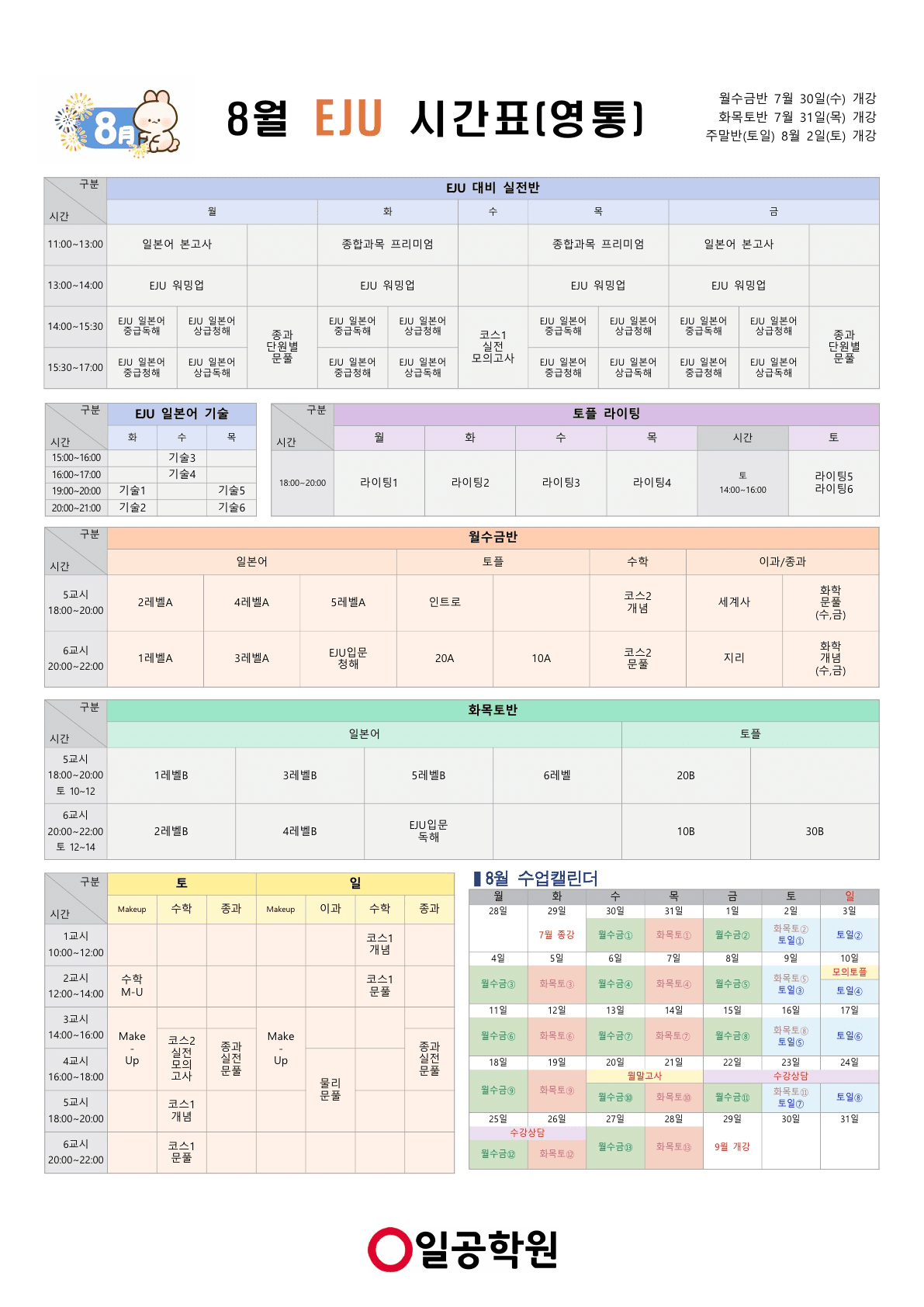 [EJU] 25년 8월 영통캠퍼스 시간표
