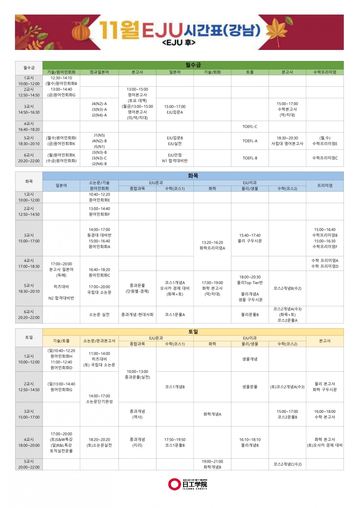 [EJU후] 25년 11월 강남캠퍼스 시간표
