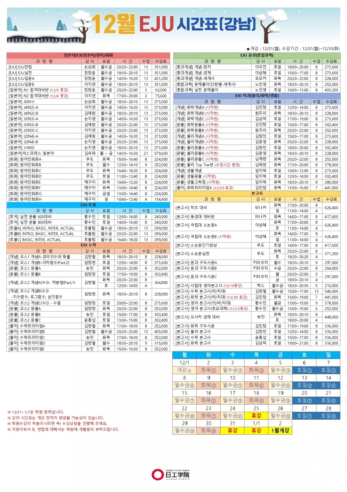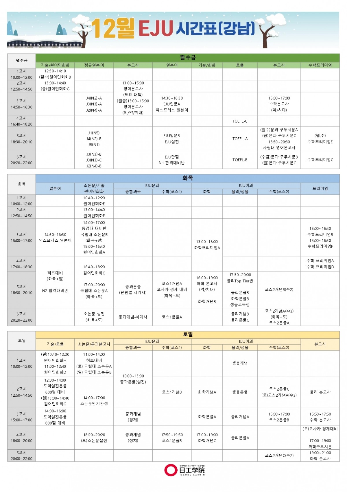 [EJU] 25년 12월 강남캠퍼스 시간표